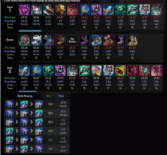 💬 ランクが上がるにつれて、エンチャンターアイテムを選んでWを先に上げるプレイヤーが増えるのは当然の流れだ。高レートのプレイヤーは統計的に最も強いビルドを好む。