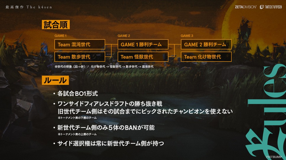 変則ルールとして、新しい世代のチームが先に戦い、勝ち残り方式で優勝を争うという特殊な方式のBo1トーナメントで行われます。更にピックの制限として旧世代側のチームはその試合までにピックされたチャンピオンを使用できず、新世代側のチームのみ5体のチャンピオンBANが可能です。サイド選択権は新世代側のチームが有します。